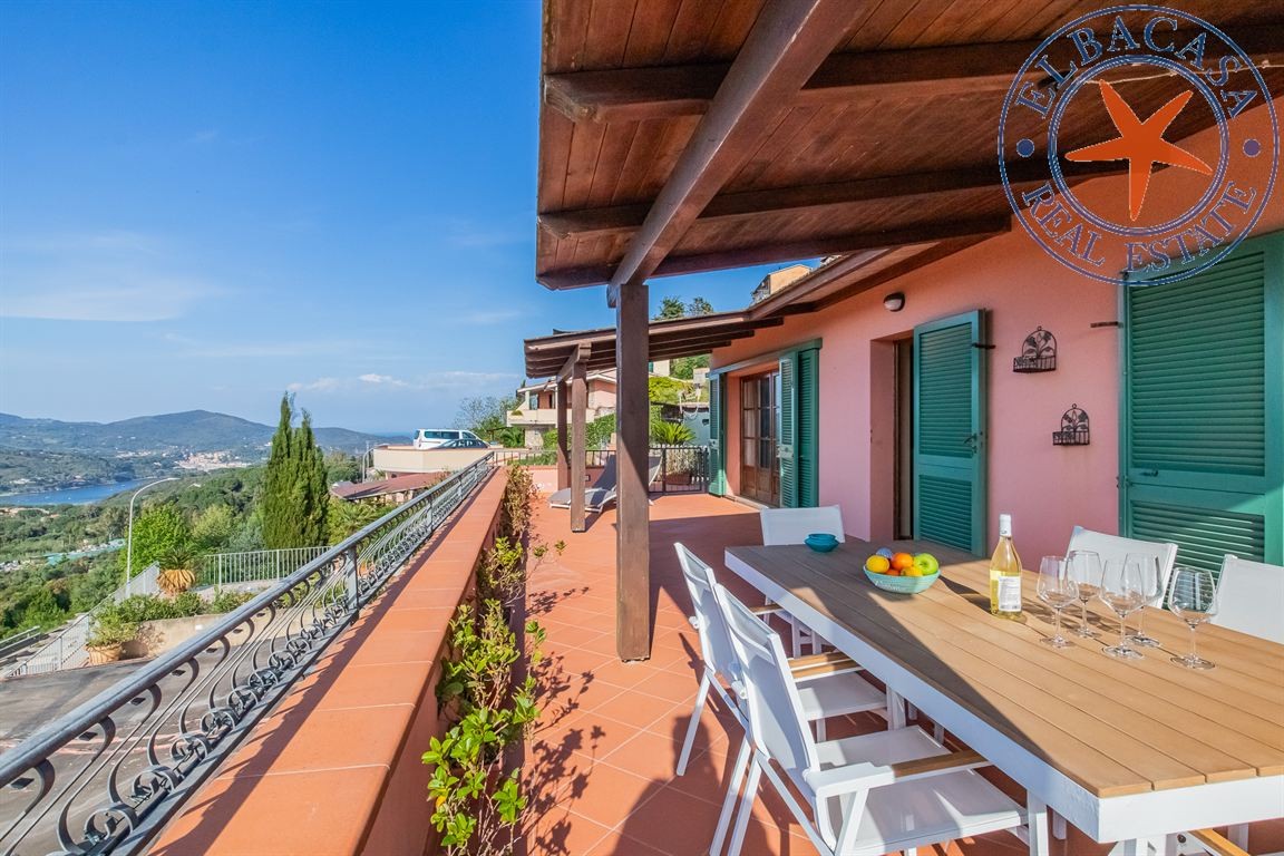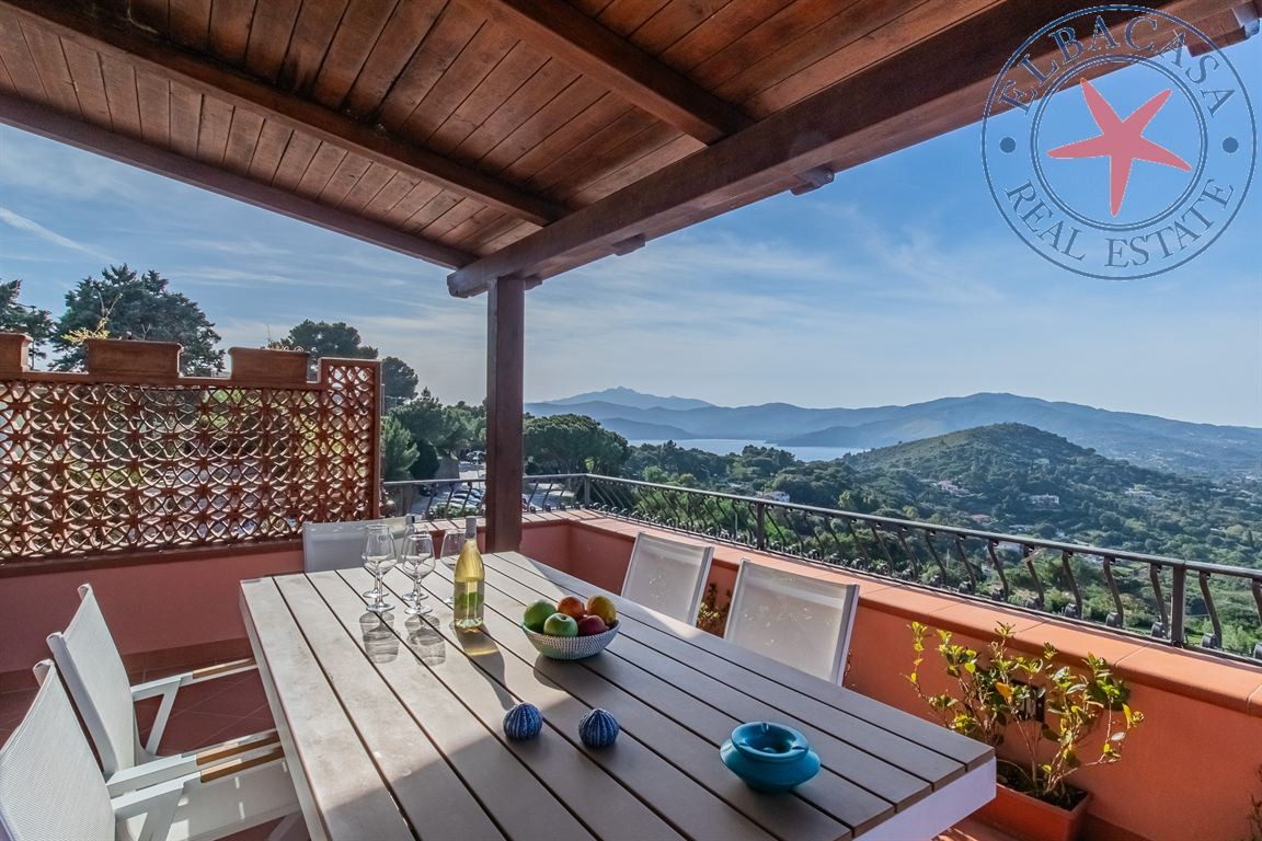 La villetta, completamente indipendente e circondata da una proprietà recintata con cancello privato e comodi spazi per il parcheggio, si distingue subito per il suo affaccio straordinario. Esposta a sud, regala una vista ampia e continua che abbraccia il profilo del Monte Capanne e si apre sul suggestivo Golfo Stella. Da qui, ogni sera, si può assistere ai tramonti tipici dell’isola, con colori caldi che si riflettono sul mare creando scenari sempre diversi. Lo sguardo si spinge oltre, fino a intravedere Porto Azzurro e, nelle giornate più limpide, anche Portoferraio, offrendo un panorama aperto a 180 gradi che rende questa proprietà davvero unica.