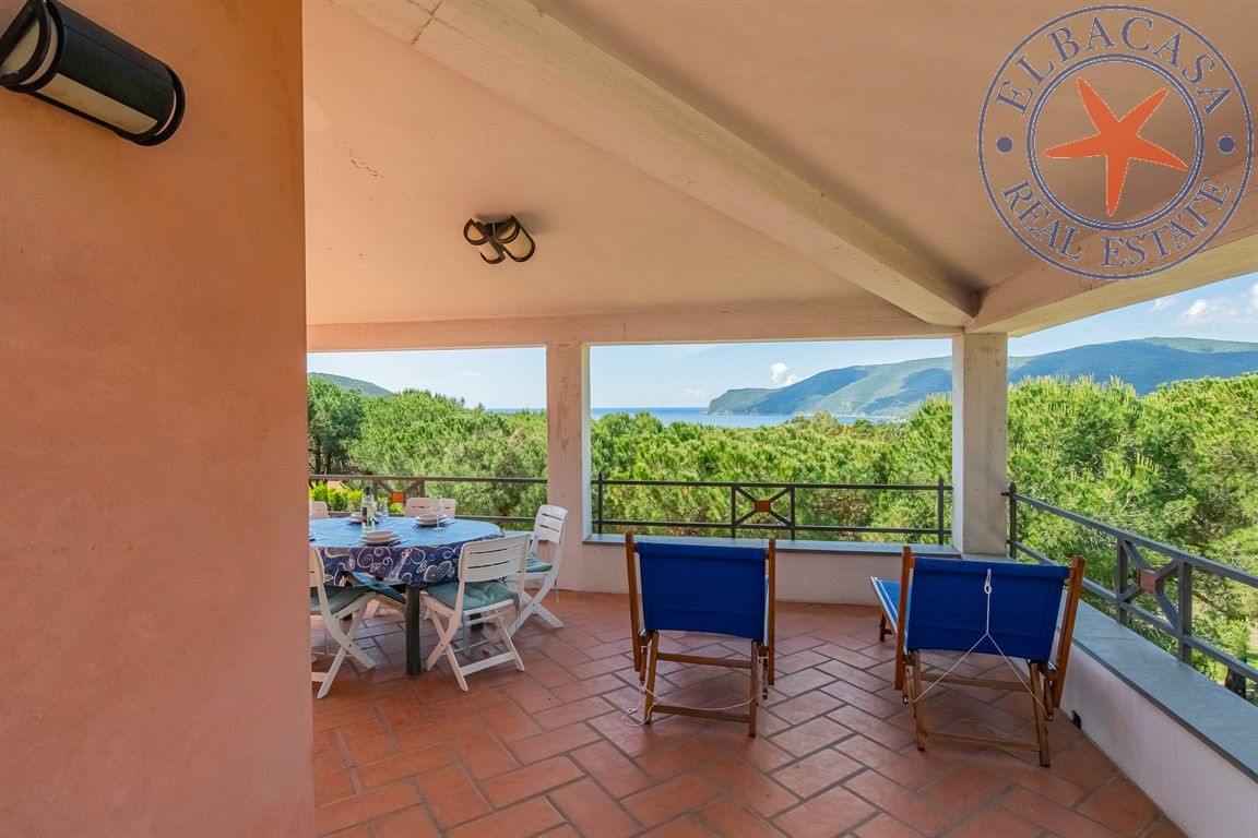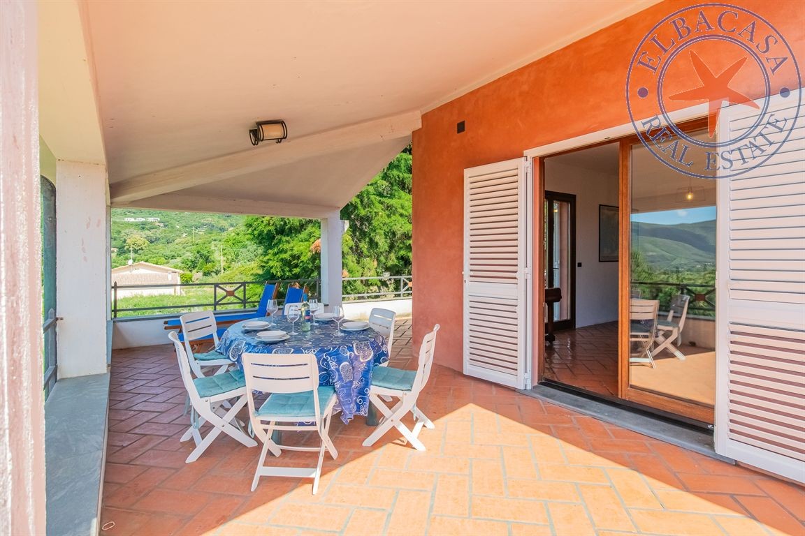 Uno dei punti di forza della villa è la splendida terrazza vista mare con portico, perfetta per godere appieno dei tramonti elbani e della tranquillità del luogo.